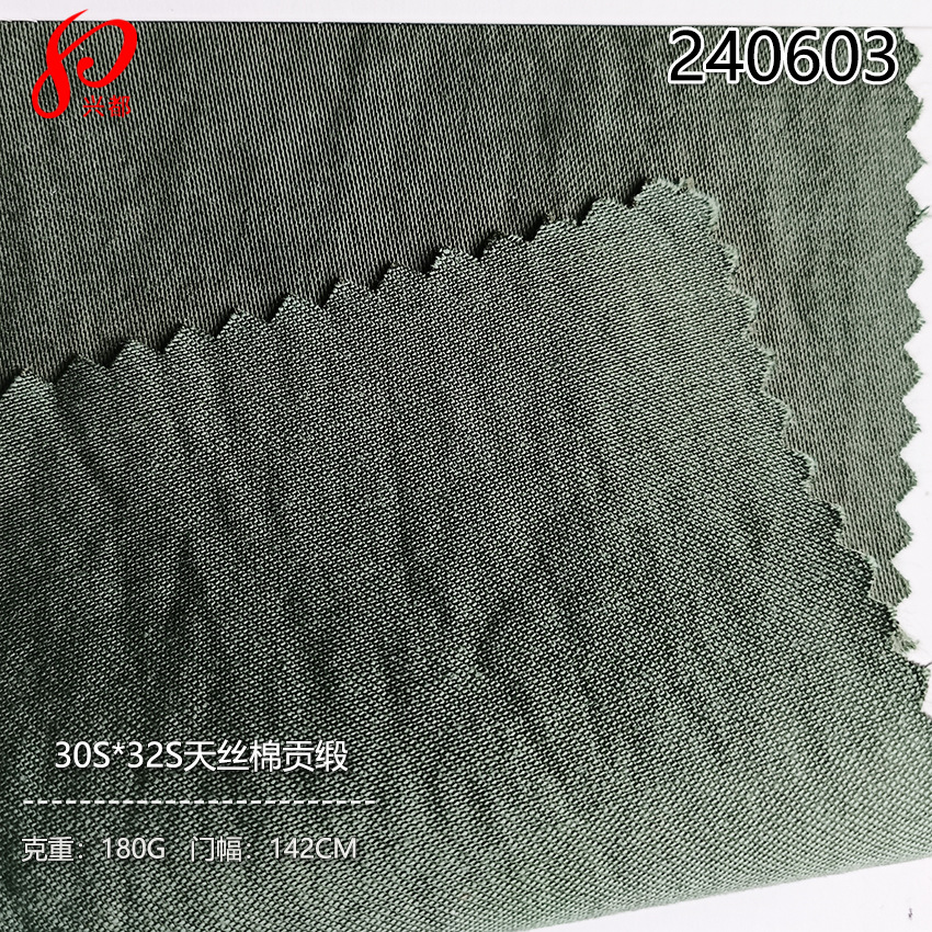 ■布号:240603 ■类别:天丝棉贡缎 ■纱支:30S*32S ■密度:164*76 ■组织:4/1贡缎 ■成份:70%天丝30%棉 ■克重:180(g/m 2) ■幅宽:142(cm)